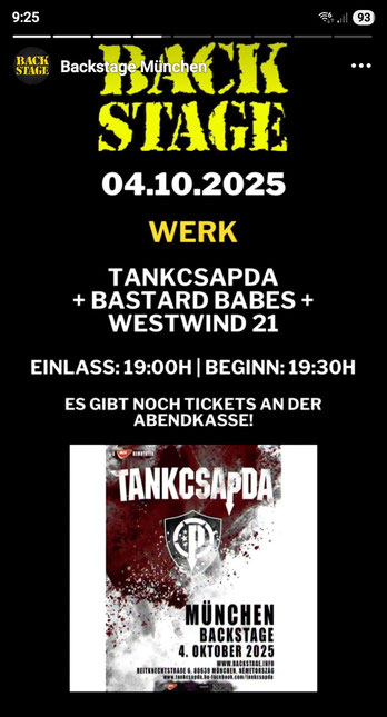 04. Oktober 2025 4. Oktober live in München 4. Oktober 2025 Kleiner Reminder für heute Abend, vom Backstage gepostet, wir freuen uns schon sehr auf den Gig. #Tankscapdalive #Backstage #BackstageMünchen #Bastardbabeslive #Münchenlive #Oktoberfest #münchenwoistwaslos tagPlaceholderTags: